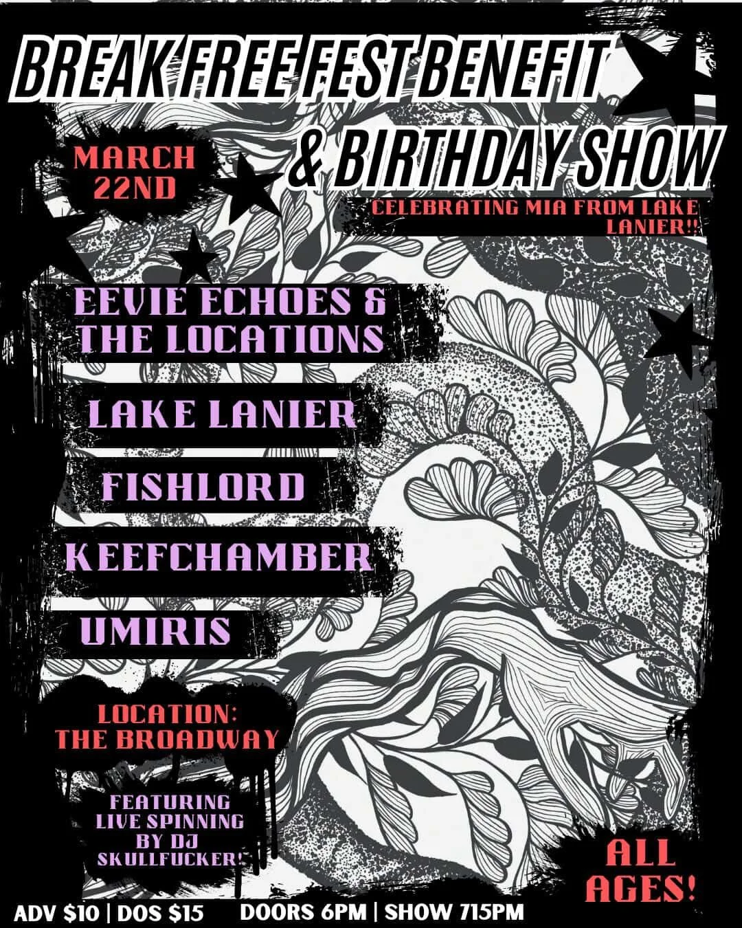 A Break Free Fest Benefit & birthday show at The Broadway w/ Eevie Echoes and The Locations, Lake Lanier, Fishlord Keef + Chamber Umir